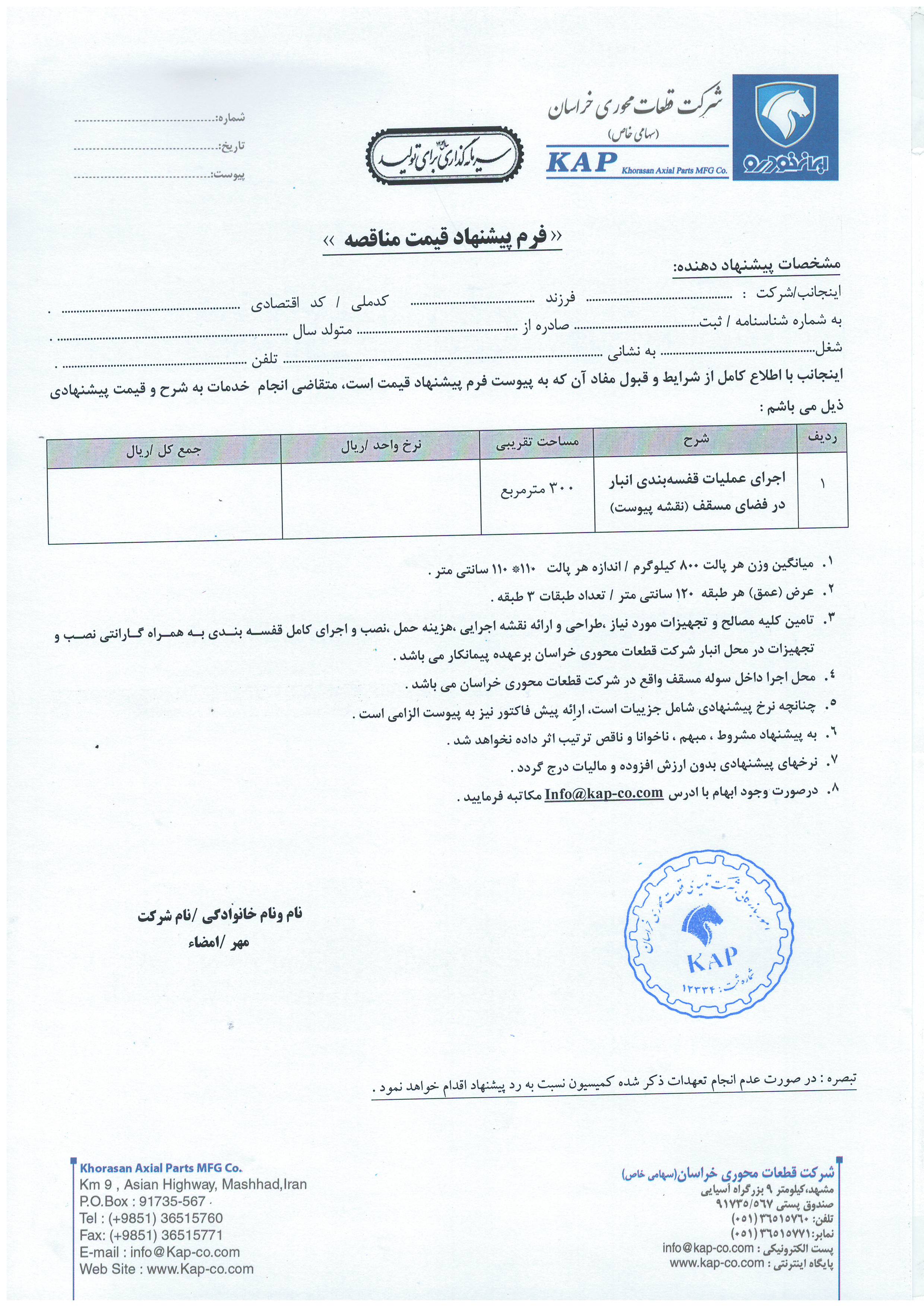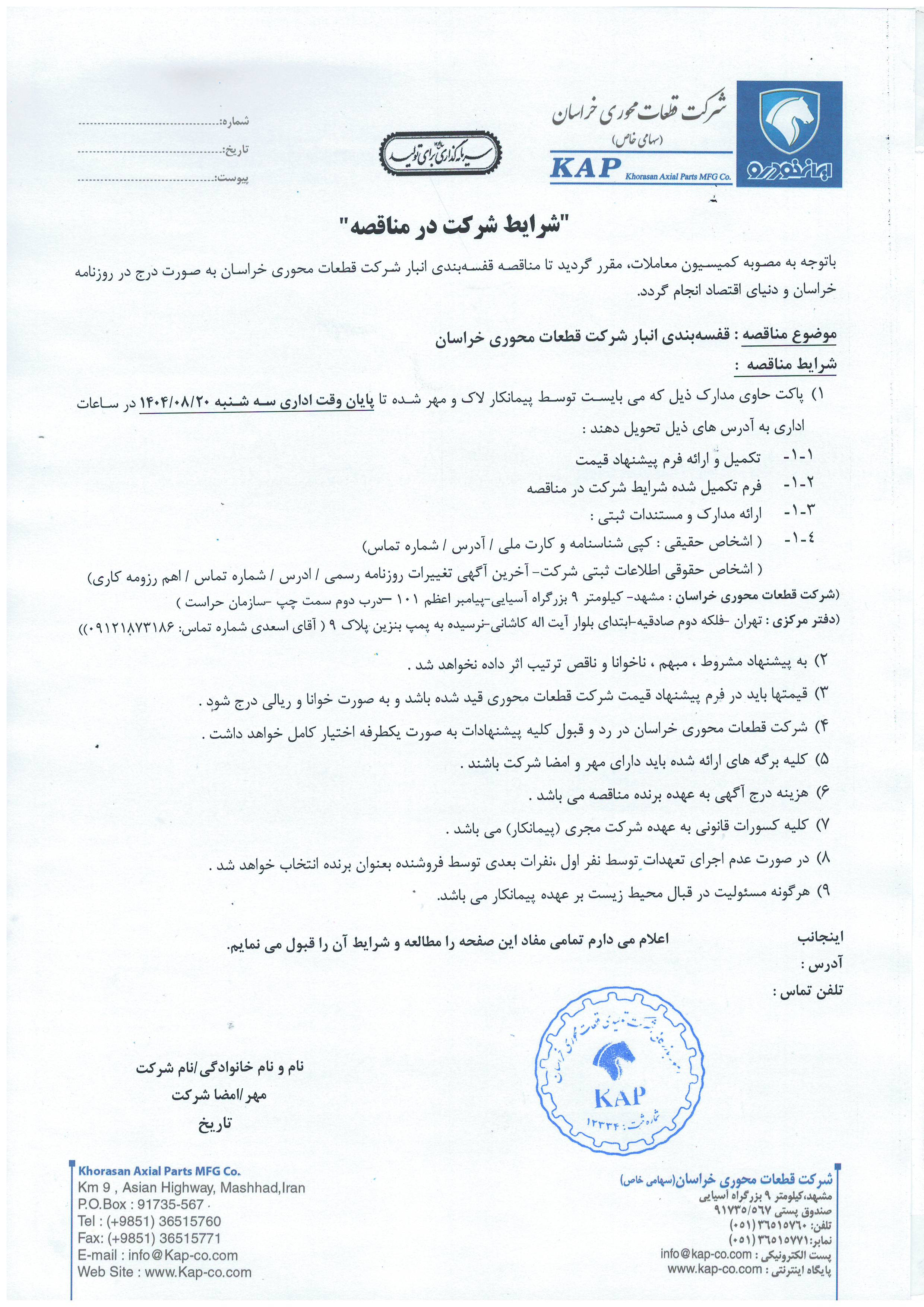 نشاني و محل دريافت اسناد : بزرگره آسيايي كيلومتر 9 جاده مشهد قوچان پيامبر اعظم 101 – شرکت قطعات محوری خراسان – شماره تماس 36515763-051 – www.kap-co.com